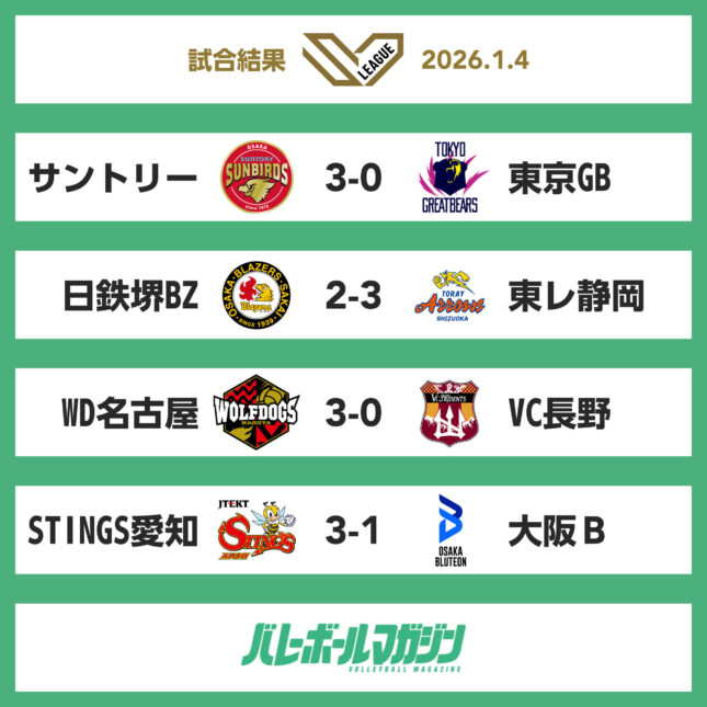 - 埼玉上尾が2試合連続のフルセット勝利。大阪MVも2勝。群馬対Astemoは1勝1敗に SV女子 [SV女子] / 2026.01.07