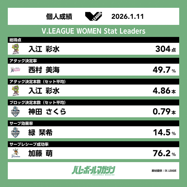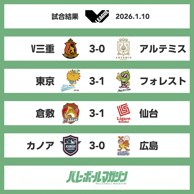 1月10日、11日バレーボール女子・V.LEAGUE WOMENはAGF鈴鹿体育館(三重県)、軽井沢風越公園総合体育館(長野県)、水島緑地福田公園体育館(岡山県)、田川市総合体育館(福岡県)にて両日各4試合を開催した。