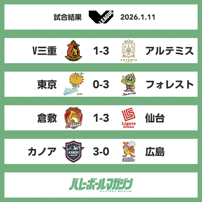【V.LEAGUE WOMEN・11日の結果】