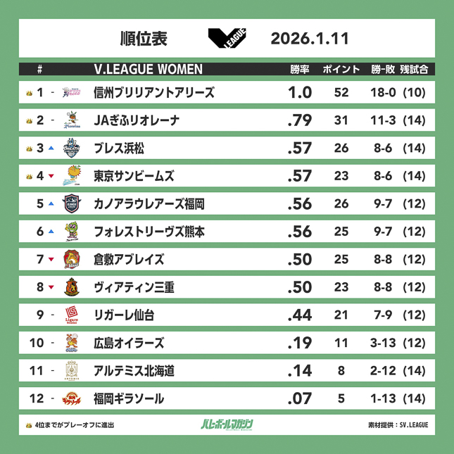 1位の信州ブリリアントアリーズ、2位のJAぎふリオレーナが頭一つ抜け出しているが、以下3位のブレス浜松から9位のリガーレ仙台までは僅差で並ぶ。