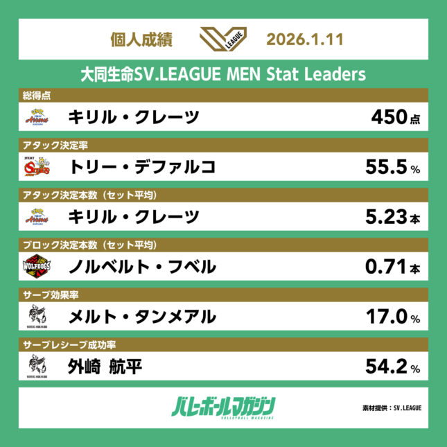 サーブは水町が2位、髙橋藍が4位、西田が5位、深津英臣(WD名古屋)が7位と日本人選手の活躍が目立つ。