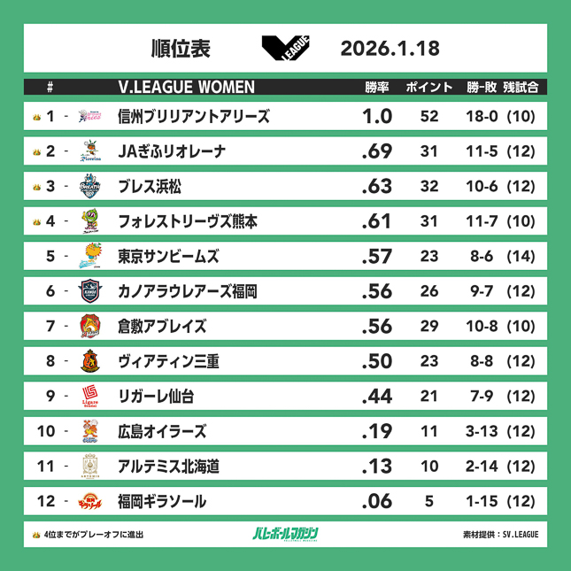 1位 信州ブリリアントアリーズ 18勝0敗 (勝率1.00, 52ポイント)