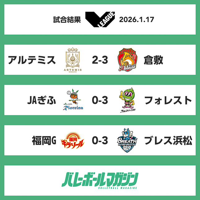 1月17日、18日バレーボール女子・V.LEAGUE WOMENは北ガスアリーナ札幌46(北海道)、OKBぎふ清流アリーナ(岐阜県)、福岡市民体育館(福岡県)にて両日各3試合を開催した。