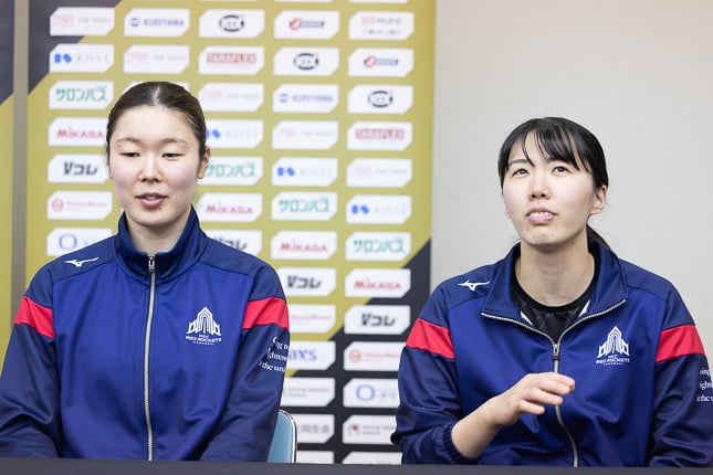 甲:自分はオフェンスを武器にしているので、ブロックが完成する前に打つために、中川(つかさ)選手が比較的ブロックがいないところで上げてくれるので、それがうまく決定打になっているのは増えているなと感じています。