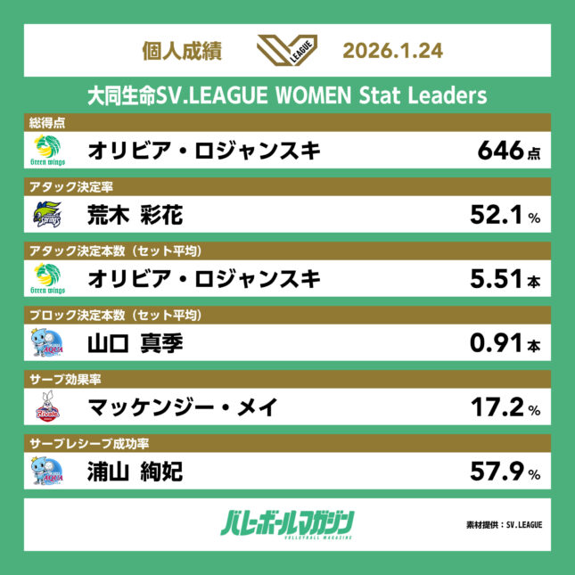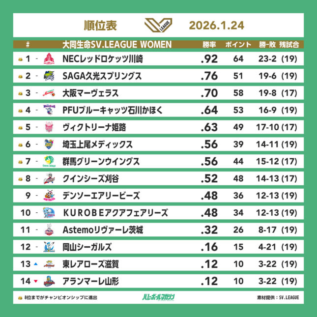 - 東地区のR栃木と西地区のクボタが2位に浮上。東西の首位・北海道YSとV三重はともに15勝目 V男子 [V男子] / 2026.01.25
