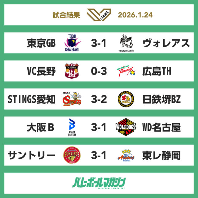 サントリー、大阪B、STINGS愛知、東京GBがホームで勝利 SV男子