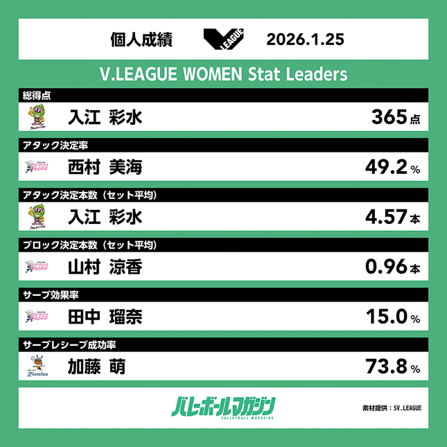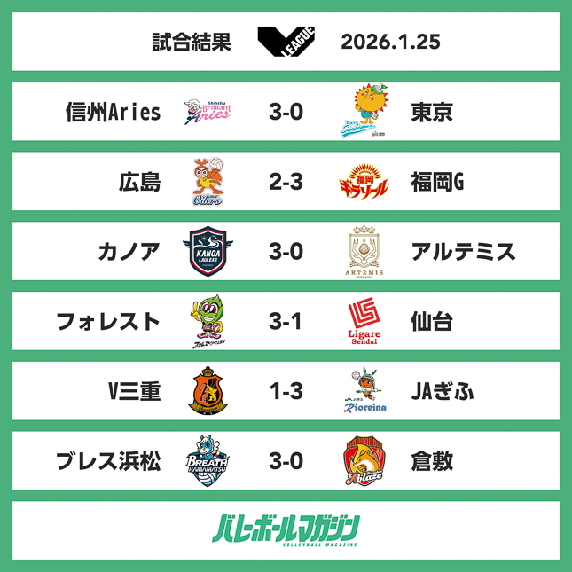 - 首位のNEC川崎など7試合中6試合でホームチームが勝利。大阪MVは東レ滋賀にフルセット勝利 SV女子 [SV女子] / 2026.01.25
