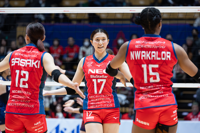 大田区総合体育館ではNECレッドロケッツ川崎とAstemoリヴァーレ茨城が対戦し、セットカウント2-3のフルセットでアウェイのAstemoが勝利。現在11位のAstemoが首位のNEC川崎から大金星を挙げた。この試合ではミドルブロッカーの佐藤黎香がアタック決定率64.7%を挙げ、POMを獲得。今季からオポジットに転向した高間来瞳はアタックで12得点を挙げたほか、本人が苦手と語るサーブレシーブでも成功率62.5%と健闘した。