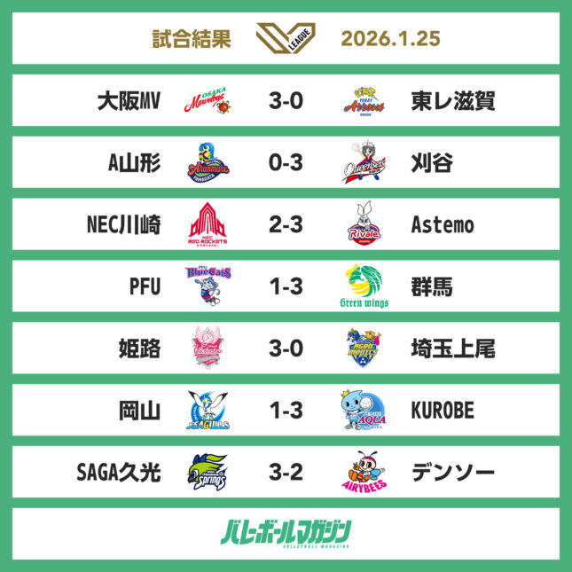 - 首位のNEC川崎など7試合中6試合でホームチームが勝利。大阪MVは東レ滋賀にフルセット勝利 SV女子 [SV女子] / 2026.01.25
