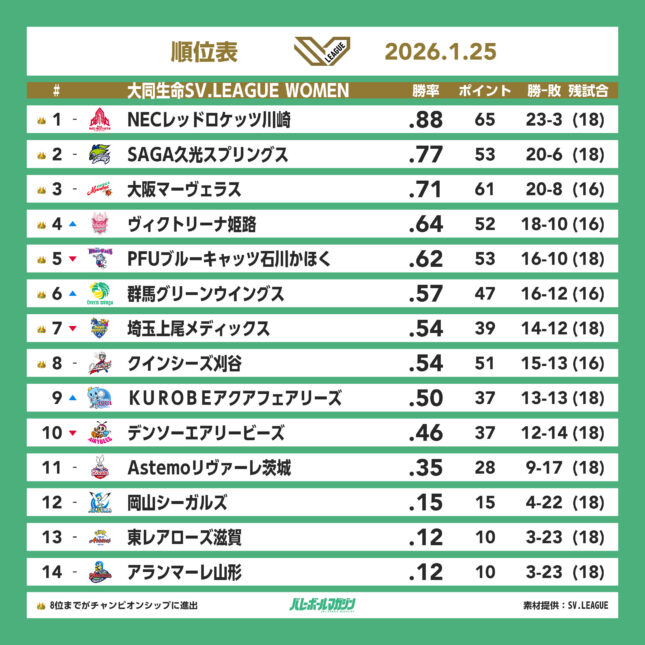 - 首位のNEC川崎など7試合中6試合でホームチームが勝利。大阪MVは東レ滋賀にフルセット勝利 SV女子 [SV女子] / 2026.01.25