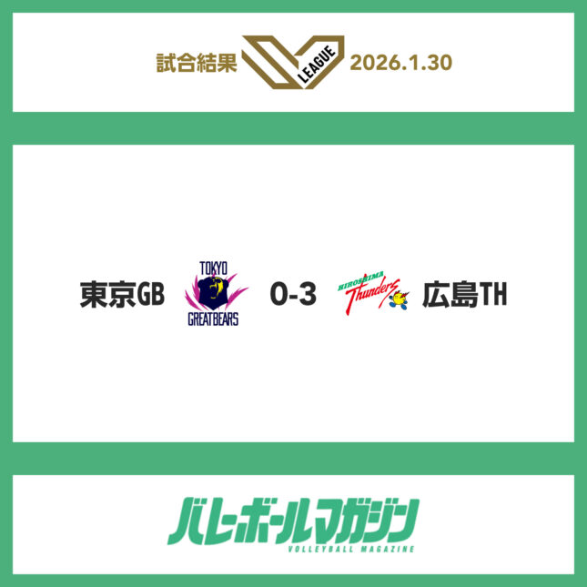 国立代々木競技場第一体育館では東京グレートベアーズと広島サンダーズが対戦し、セットカウント0-3でアウェイの広島THが勝利。今季11勝目を挙げた。ストレートで決着したものの、3セット中2セットがデュースにもつれ込む接戦となった。