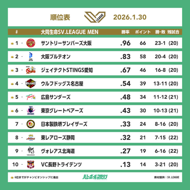 1位 サントリーサンバーズ大阪 23勝1敗 (勝率0.96, 66ポイント)