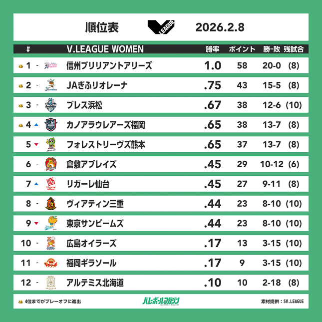 - 東地区はサンガイアが2位に浮上。西地区は首位のV三重など上位勢が白星を重ねる V男子 [V男子] / 2026.02.08