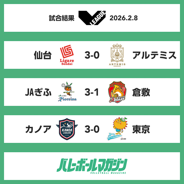 - 4試合すべてアウェイチームが勝利。首位サントリーは1敗守り、24勝目 SV男子 [SV男子] / 2026.02.08