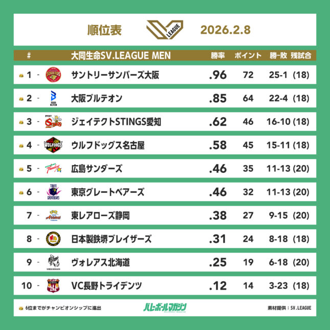 - 4試合すべてアウェイチームが勝利。首位サントリーは1敗守り、24勝目 SV男子 [SV男子] / 2026.02.08