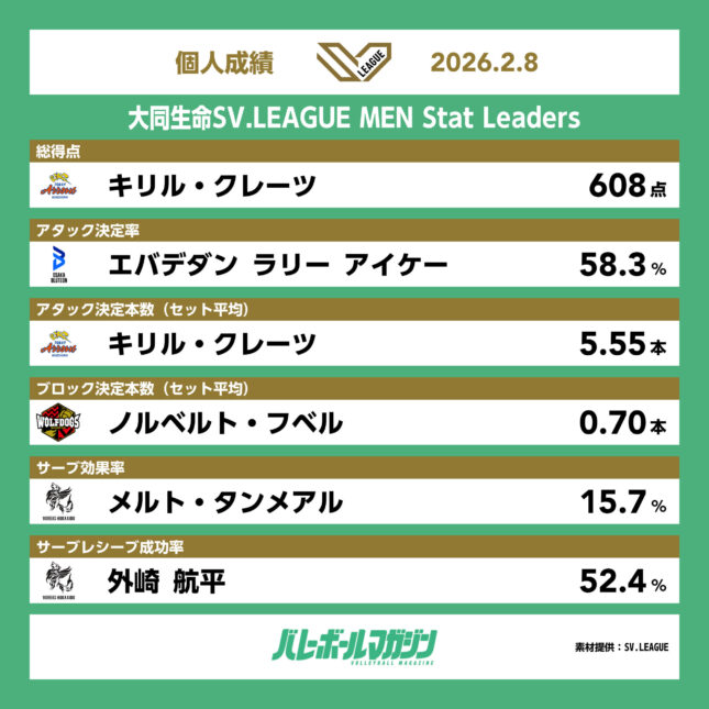 - 西地区のF鹿児島がフルセットで2連勝。東地区は2位に浮上したサンガイアがストレートで2勝 V男子 [V男子] / 2026.02.10