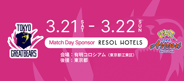 東京グレートベアーズは3月21日(土)22日に行われる試合(3/21-22有明コロシアム VS.東レアローズ)にてツーリストホテル「リソルホテルズ」を展開するリソル株式会社をマッチデースポンサーとしたホームゲーム『RESOL HOTELS DAY』開催する。