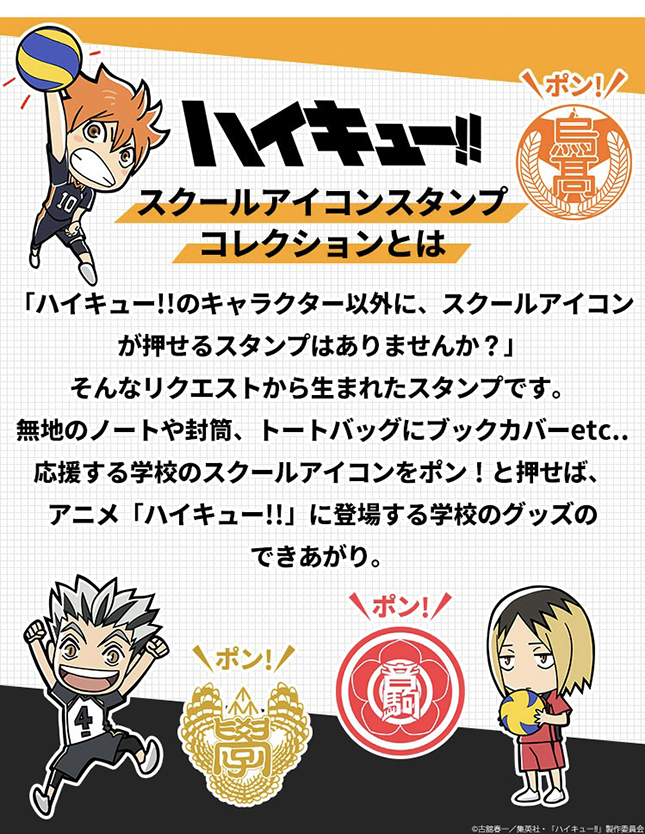 インターネットのはんこ屋さん「印鑑はんこSHOPハンコズ」を運営する株式会社岡田商会(所在地:大阪府大阪市)は自社オンラインショップにて、押すだけでアニメ「ハイキュー!!」に登場する学校のマークをポン!と押して楽しめる『ハイキュー!! スクールアイコンスタンプコレクション』の販売を開始した。