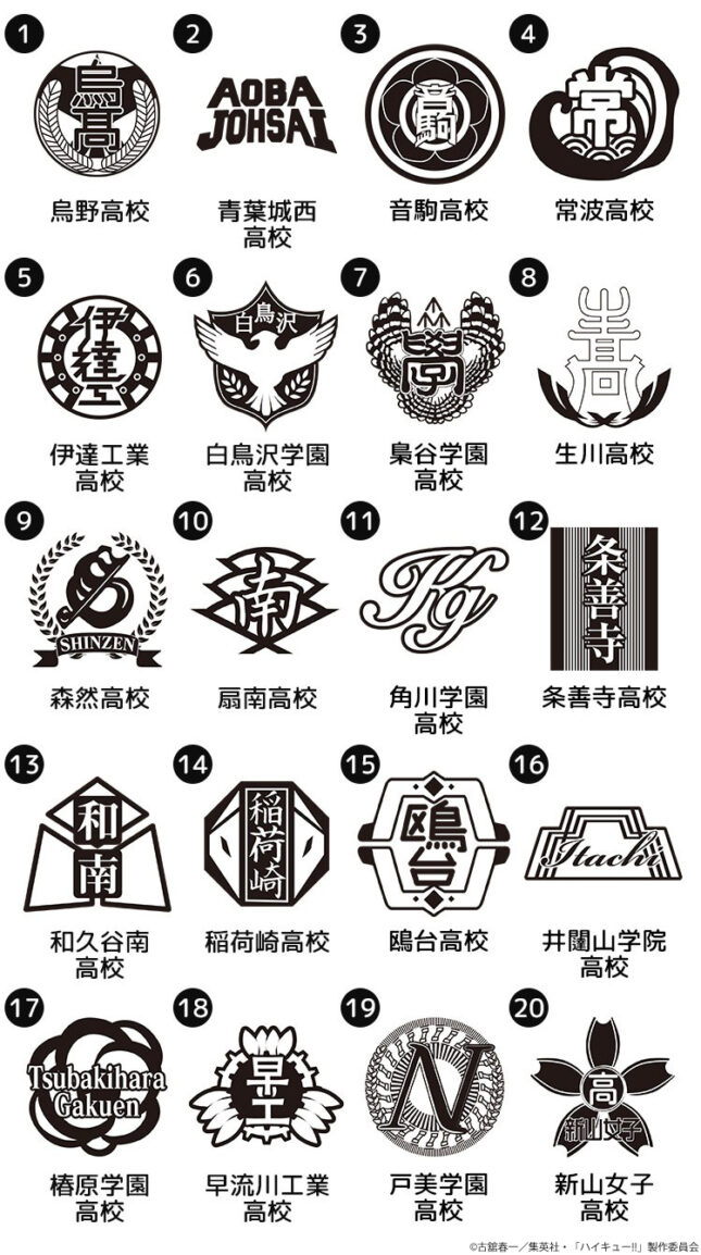 スクールアイコンのデザインはこちらの20種類。烏野高校や青葉城西高校はもちろん、音駒高校、伊達工業高校、白鳥沢学園高校、梟谷学園高校、稲荷崎高校などアニメに登場した各校のスクールアイコンが勢ぞろいする。