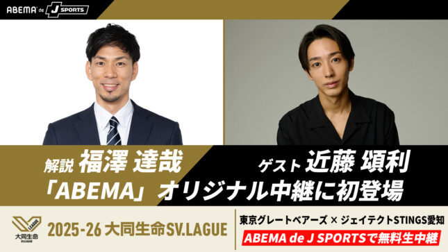 ABEMAは、2月14日(土)に開催される「2025-26 大同生命SV.LEAGUE MEN」第14節、東京グレートベアーズ対ジェイテクトSTINGS愛知の試合を無料生中継を実施する。解説はバレーボール元日本代表の福澤達哉氏、ゲストには俳優の近藤頌利氏が出演する。
