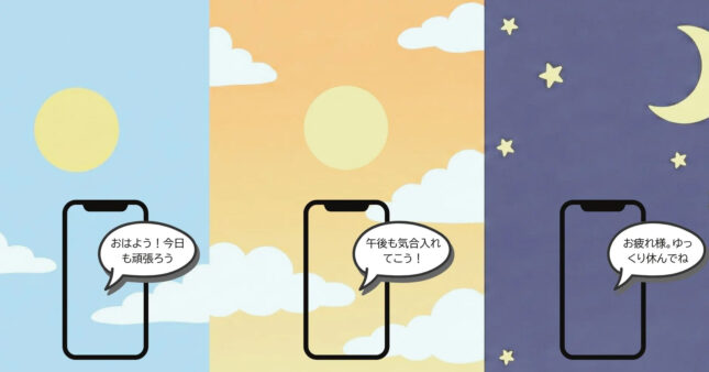 朝の「おはよう!今日も1日がんばろう!」といったメッセージから始まり、夜は1日頑張ったあなたを癒すメッセージをお届け。