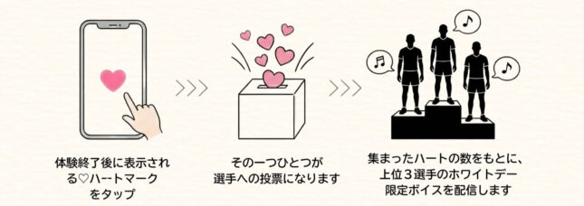 2月14日(土)〜2月28日(土)の投票期間にタップされたハートマークの数を集計し、上位3名の選手を選出。選ばれた選手による「ホワイトデー限定ボイス」の配信を決定する、ファン参加型の投票企画を展開いたします。