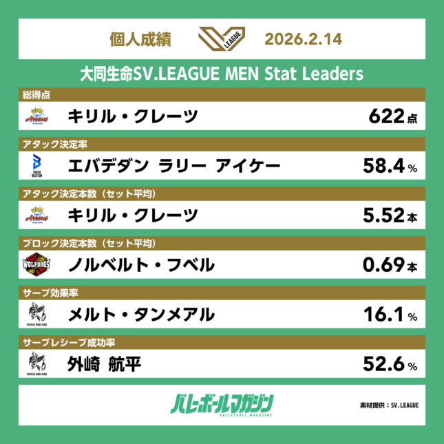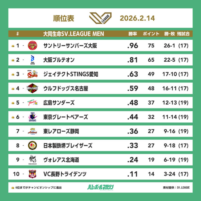 14日、バレーボール男子・大同生命SV.LEAGUE MENはGAME1の5試合が行われた。今回は前節からの順位変動はなかった。