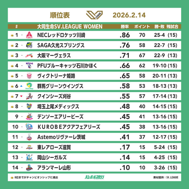 首位NEC川崎が佐藤淑乃を欠く中、デンソーにフルセットで競り勝ち、25勝目。SAGA久光と大阪MVは22勝目 SV女子