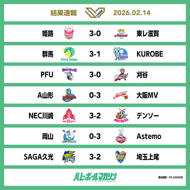 - 日鉄堺BZがホームでヴォレアスに3-1で勝ち、9勝目。大阪Bが広島THにフルセットで敗れる SV男子 [SV男子] / 2026.02.14