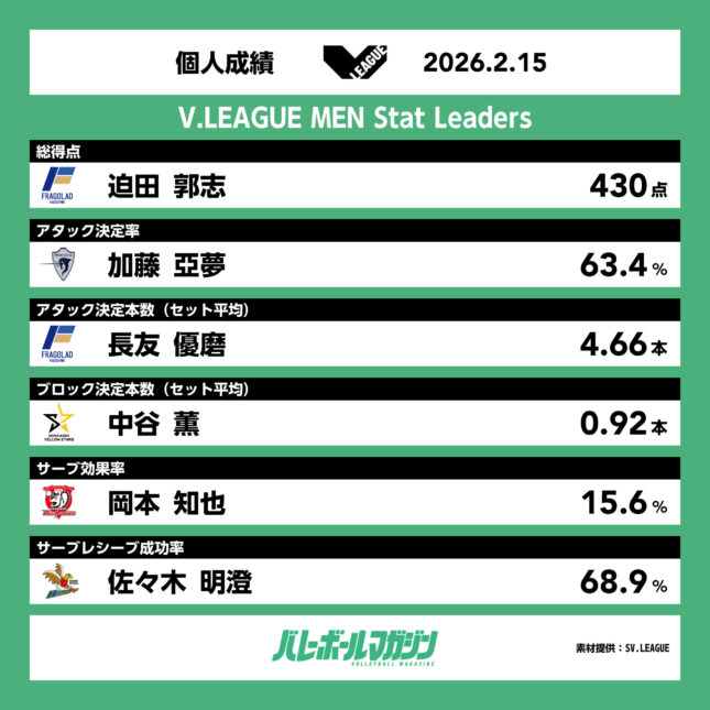 - 首位NEC川崎が佐藤淑乃を欠く中、デンソーにフルセットで競り勝ち、25勝目。SAGA久光と大阪MVは22勝目 SV女子 [SV女子] / 2026.02.15