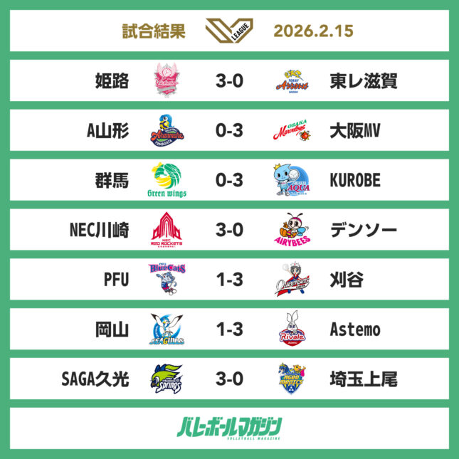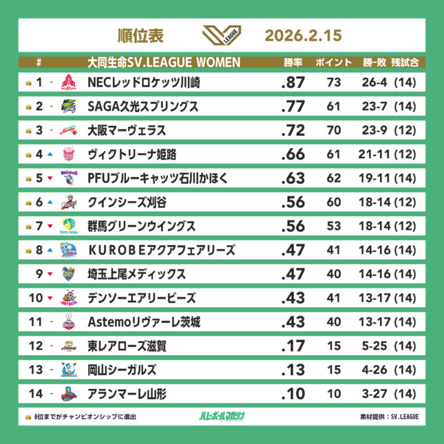 - 首位NEC川崎が佐藤淑乃を欠く中、デンソーにフルセットで競り勝ち、25勝目。SAGA久光と大阪MVは22勝目 SV女子 [SV女子] / 2026.02.15