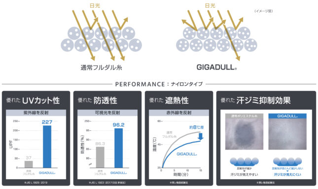 VEIL TECH™は、東レ製の次世代繊維GIGADULL®を採用。通常のフルダル糸よりも高濃度で酸化チタンを添加した糸を用いることにより、高い防透性や遮熱性、汗ジミ抑制などの優れた機能を併せ持つ次世代繊維だ。このGIGADULL®の採用により、VEIL TECH™として必要な機能を持たせることに成功し、選手がプレーに集中できるユニフォームの製造が可能となった。