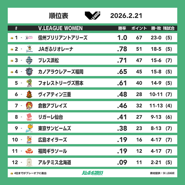 信州ブリリアントアリーズのレギュラーシーズン優勝が確定、ブレス浜松が怒涛の9連勝で追い上げも V女子