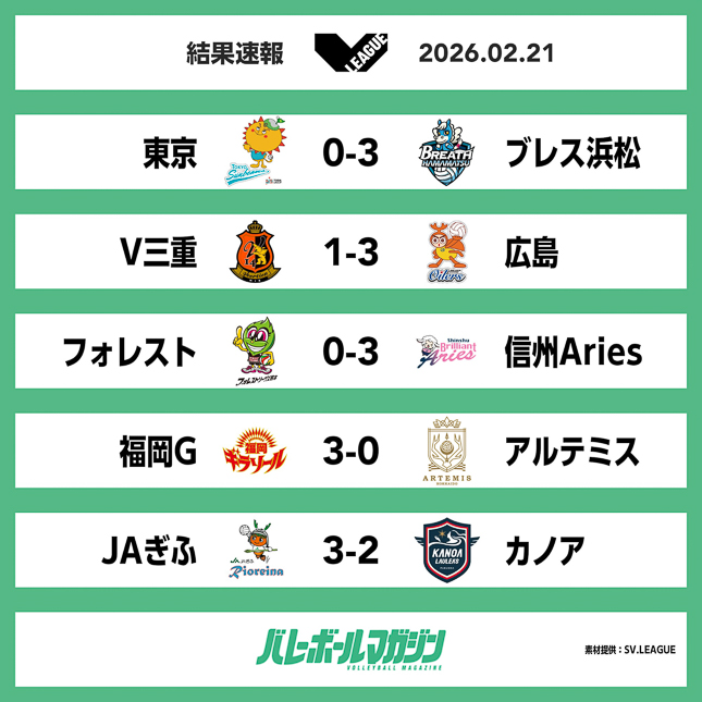 2月21日バレーボール女子・V.LEAGUE WOMENは中央区立総合スポーツセンター(東京)、安濃中央総合公園内体育館(三重)、ウイングまつばせ(熊本)、飯塚市総合体育館(福岡)、OKBぎふ清流アリーナ(岐阜)にて各5試合を開催した。