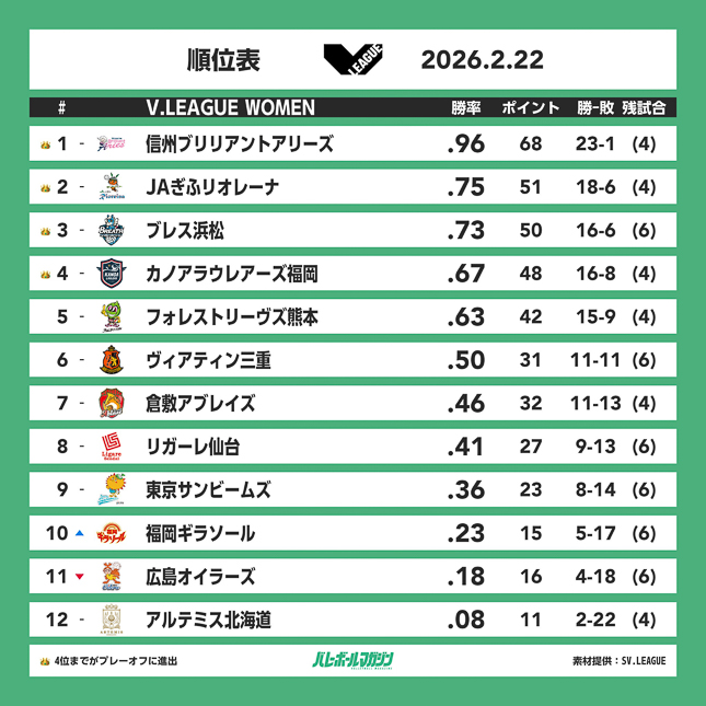 1位 信州ブリリアントアリーズ 23勝1敗 (勝率0.96, 68ポイント)