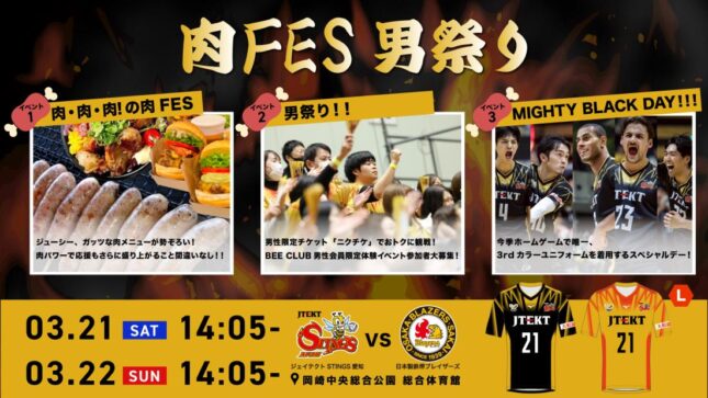 ジェイテクトSTINGS愛知 3月21日/22日ホームゲームにて『肉FES男祭り』開催!