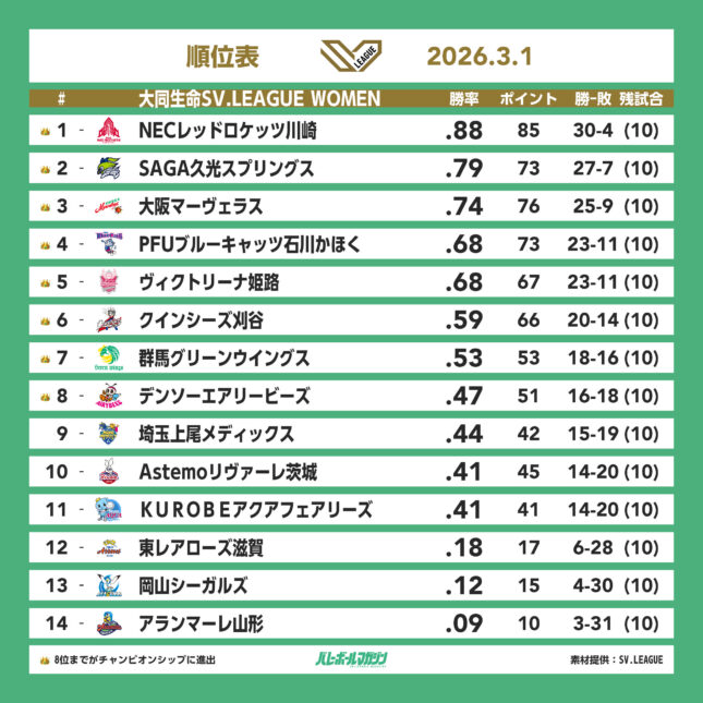 SAGA久光と大阪MVのチャンピオンシップ進出が決定 SV女子