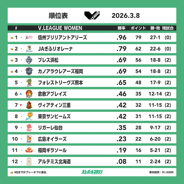 信州ブリリアントアリーズが27勝でレギュラーシーズンを終える。プレーオフ残り2枠は最終節に確定。ブレス浜松、カノアラウレアーズ福岡、フォレストリーヴズ熊本が争う V女子