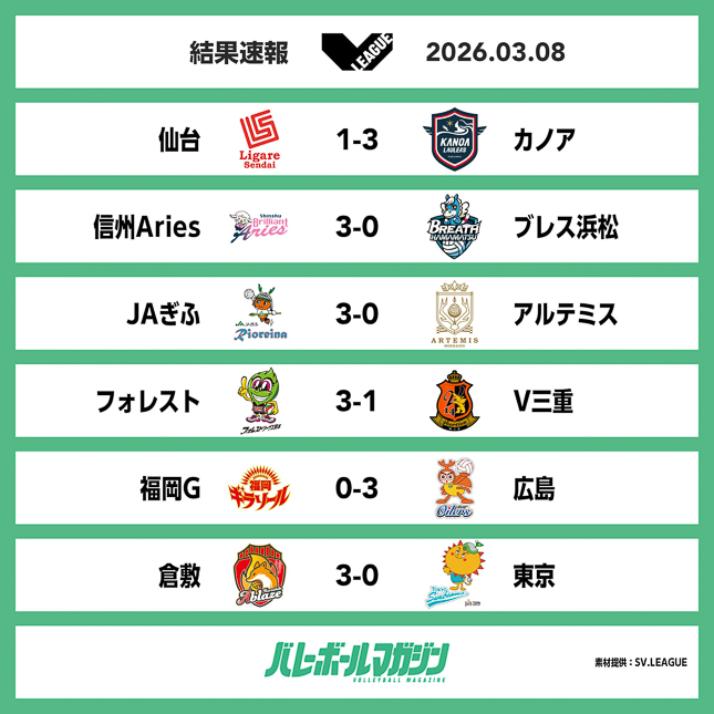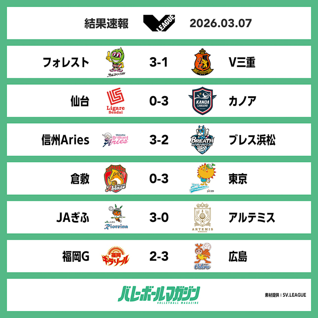3月7日、8日バレーボール女子・V.LEAGUE WOMENはウイングまつばせ(熊本)、本山製作所青葉アリーナ(宮城)、ことぶきアリーナ千曲(長野)、水島緑地福田公園体育館(岡山)、OKBぎふ清流アリーナ(岐阜)、福岡市民体育館(福岡)にて各6試合を開催した。