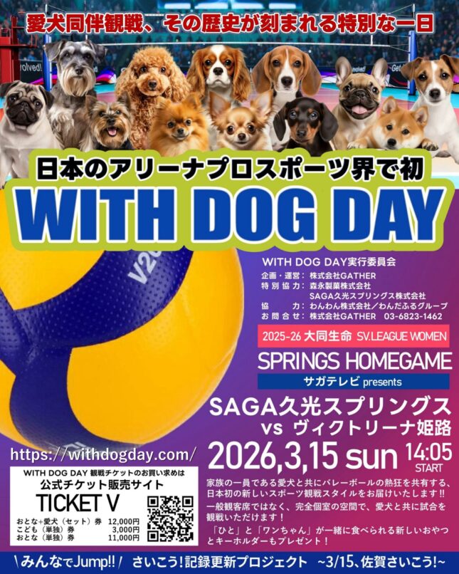 SAGA久光スプリングスは、森永製菓株式会社の特別協力の下、2026年3月15日(日)のホームゲームにおいて、SV. LEAGUE初となる愛犬同伴観戦イベント「WITH DOG DAY」を開催を発表した。