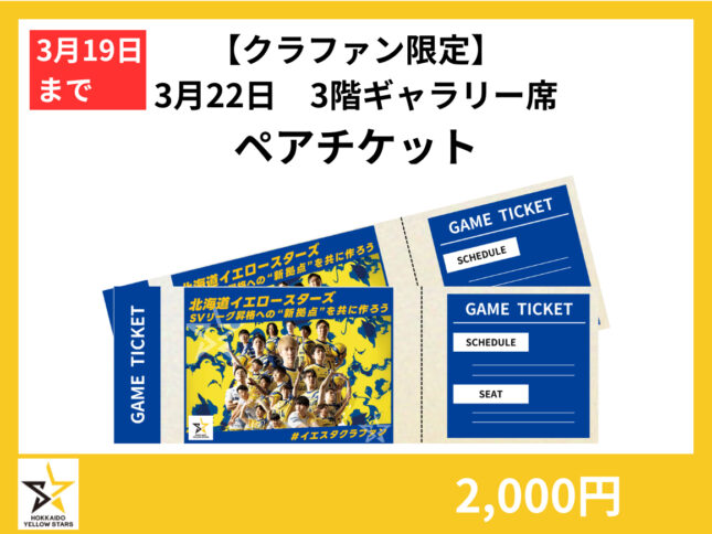 3月21日 3階ギャラリー席ペアチケット *3月19日〆切 画像:株式会社北海道イエロースターズ スポチュニティ株式会社