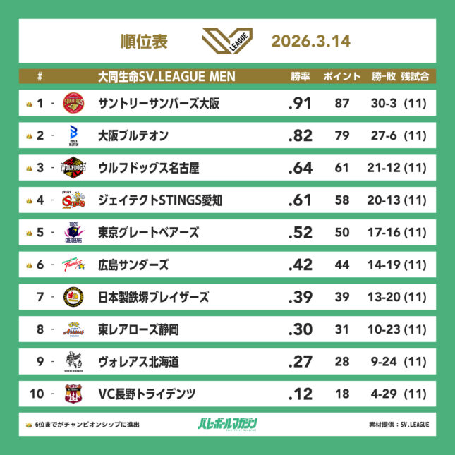- サントリーのレギュラーシーズン4位以上が確定。クォーターファイナルホームゲーム開催権を獲得 SV男子 [SV男子] / 2026.03.16