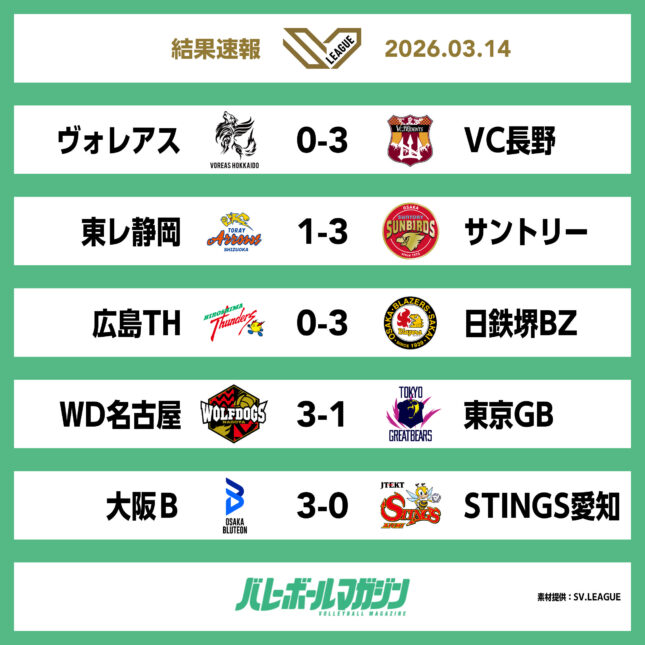WD名古屋がホームで東京GBに3-1で勝利。6・7位対決はアウェイの日鉄堺BZが広島THにストレート勝利 SV男子