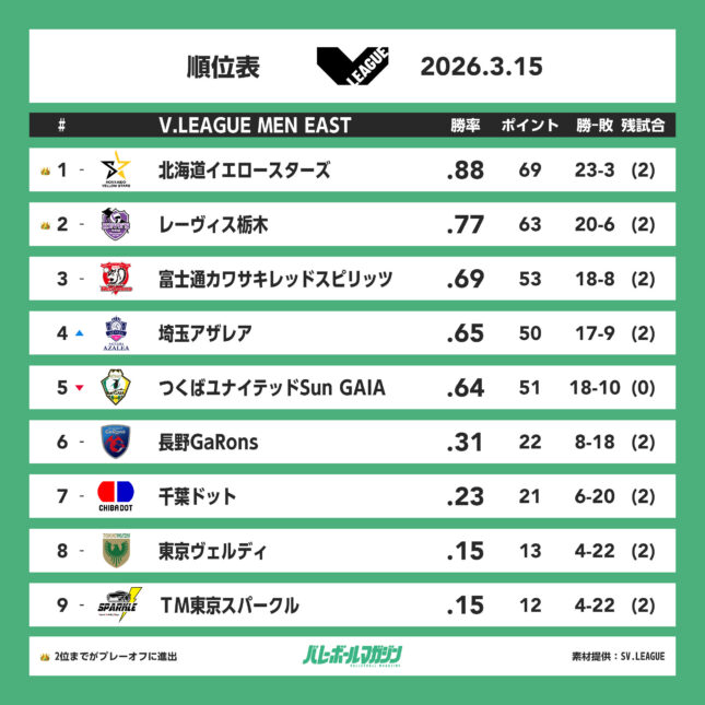 東地区・R栃木のプレーオフ進出が決定。東地区・北海道YSと西地区・クボタのレギュラーシーズン優勝が決まる V男子