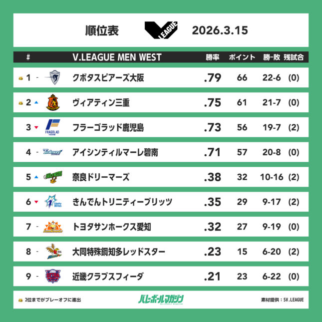 - サントリーのレギュラーシーズン4位以上が確定。クォーターファイナルホームゲーム開催権を獲得 SV男子 [SV男子] / 2026.03.16