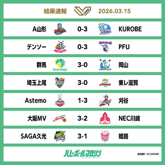 15日、バレーボール女子・大同生命SV.LEAGUE WOMENは7試合が行われた。