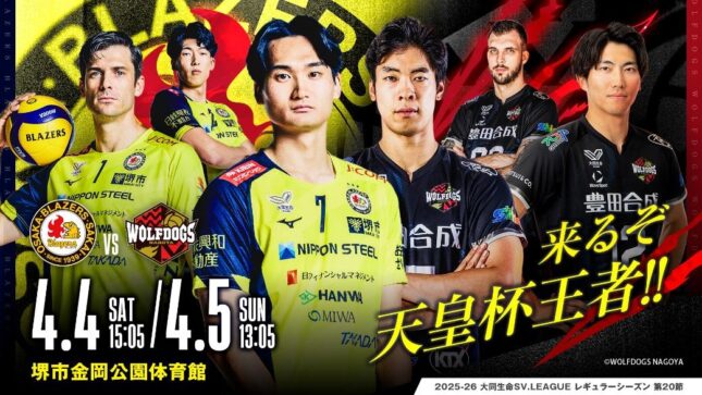 日本製鉄堺ブレイザーズは、2026年4月4日(土)・5日(日)の2日間、堺市金岡公園体育館にて、昨年の天皇杯王者・ウルフドッグス名古屋を迎えたホームゲームを開催する。レギュラーシーズン最終戦を目前に控えた本節は、チャンピオンシップ進出を争うチームにとって正念場となる極めて重要な一戦となる。