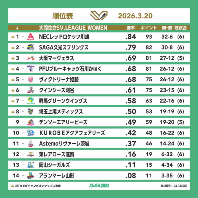 既にチャンピオンシップ(プレーオフ)進出が決定している大阪MVはホームで12敗目を喫したものの、3位をキープ。チャンピオンシップ進出の可能性が残るデンソーも順位は9位から動きはなかった。現在、6チームのチャンピオンシップ進出が決定しており、残る切符は2枚となっている。