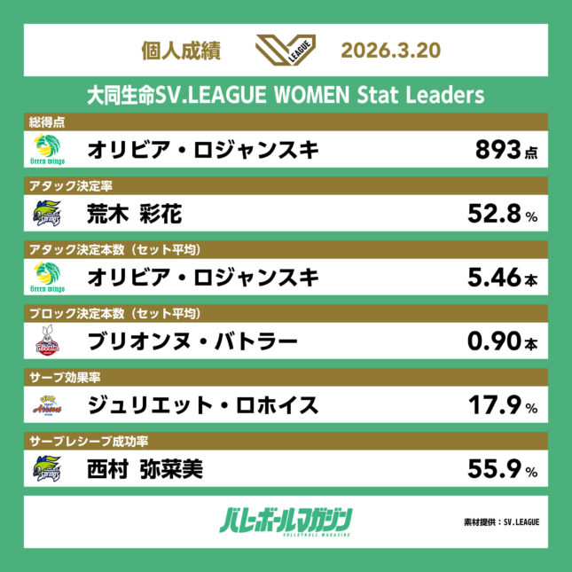 大同生命SV.LEAGUE WOMEN・20日の結果