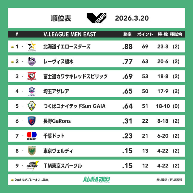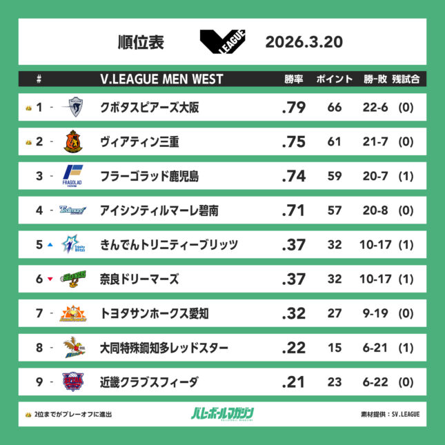 フラーゴラッド鹿児島は現在3位(20勝7敗)で、残り試合があと1戦。一方、2位のヴィアティン三重は21勝7敗で全試合終了しており、フラーゴラッド鹿児島がGAME2に勝利した場合は21勝7敗で並ぶ。3-1以上であれば勝ち点でフラーゴラッド鹿児島が上回り、逆転でプレーオフ進出が決定する。3-2の場合は勝ち点も並び、セット率でヴィアティン三重が上回るため、ヴィアティン三重がプレーオフ進出となる。